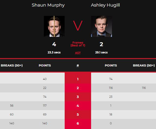 第3局中,墨菲开始在防守端提升,在乱局争夺中逐渐占据上风,墨菲零敲碎打下74-23超分赢得这局胜利。第4局墨菲进攻端开始发力,围球打出单杆56分建立优势,此后不断长台蚕食分数,117-1拿下这局胜利来到2-2平。第5局墨菲一杆60分再胜一局反超来到赛点,第6局中墨菲打出单杆140的高分,也是本届赛事目前最为单杆最高分,总分4-2墨菲胜出挺进次轮。