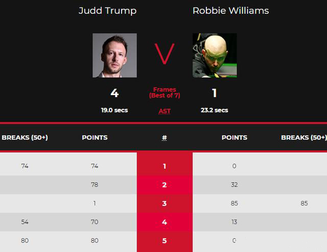 第4局中特鲁姆普围球连得54分后简单底袋失误,威廉姆斯错失继续追分机会,连得13分后顶袋长台不进,特鲁姆普再度上手超分拿下这局,总分3-1来到赛点。第5局比赛中,特鲁姆普没有再给对手机会,长台上手后围球打出单杆80分制胜,总分4-1胜出挺进第二轮。