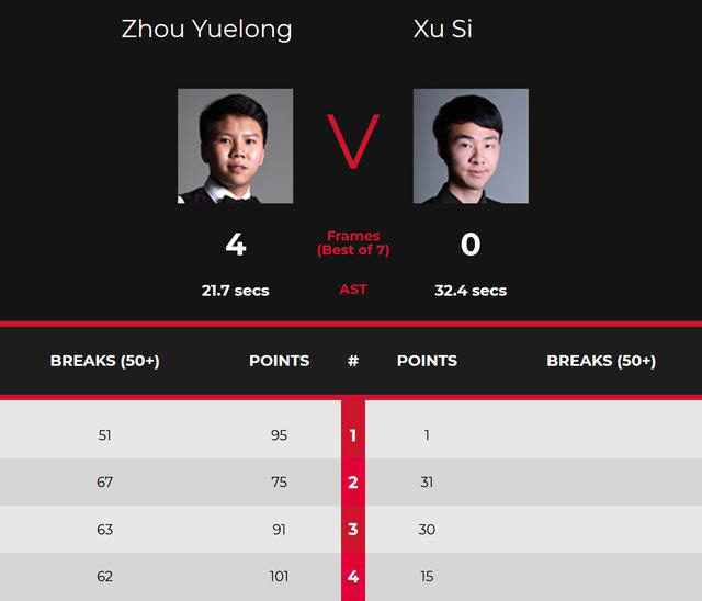 第一局,徐思完全被压制,周跃龙单杆51分、95-1大胜,取得了开门红。第二局,徐思31分后失误,并且漏下了机会,周跃龙上手打出了单杆67分、75-31再次拿下,2-0领先。