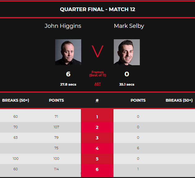 第六局,是希金斯再胜一局6-0轻松晋级,还是没有退路的“逆转王”塞尔比再次上演逆转奇迹?最终,塞尔比没有奇迹上演。希金斯打出单杆60分,114-1锁定胜局,总比分6-0将塞尔比横扫出局!