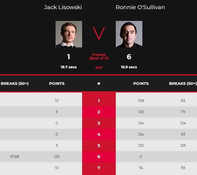 第六局,连输五局并被奥沙利文5-0拿到赛点之后,利索夫斯基只有放手一搏,避免被6-0零封的尴尬。而他在这一局终于有所斩获,并用进攻压制了奥沙利文。利索夫斯基先是打出单杆57分,随后又打出单杆68分,125-0挽救一个赛点,比分追成5-1。