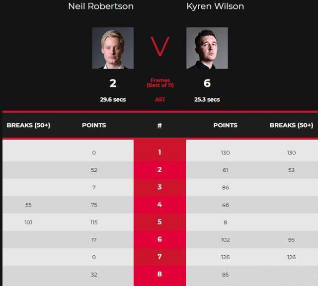 上半场威尔逊进入状态更快,首局上来就打出一杆破百,攻下130分零封先声夺人。第二局罗伯逊错失拿下的机会,威尔逊单杆得到53分,以61-52清台胜出2-0。