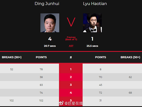 第一局,吕昊天长台上手单杆8分防守;防守比拼,丁俊晖抓住机会顶杆52分,K球效果形成贴球,选择防守;丁俊晖打带防上手,单杆26分拿下第一局。第二局,丁俊晖开局阶段,选择了远台红球尝试,可惜没有能够打进并给对手送机会。吕昊天上手之后,打出单杆62分,之后进攻黑球出现失误。丁俊晖没有机会,吕昊天再次上手很快又断掉。防守中,丁俊晖觅得机会上手,打到绿球时失误。吕昊天70-38胜出,1-1扳平比分。