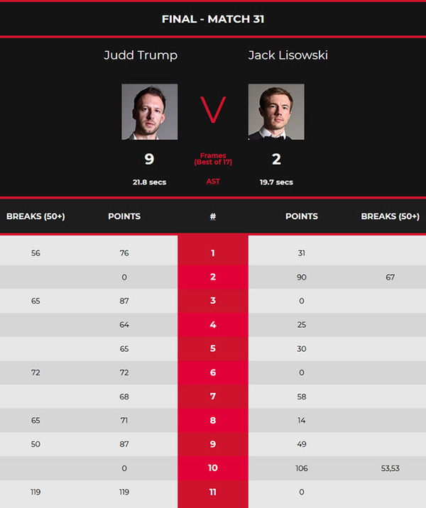 第二阶段首局,利索夫斯基的解球略显草率,他三次在没有形成障碍的情况下miss,但因为期间犯规后并未复位、而是在原地击打,三次miss并非连续在同一位置发生,遂避免直接被判负的尴尬。但小特仍成功拿下这局,8-1到达赛点,利索夫斯基终于在第10局打出两杆50+拿下,追至2-8,随后,特鲁姆普完成了决赛中唯一的一杆过百,9-2迅速获胜,将“布兰登·帕克”杯和8万英镑奖金收入囊中。