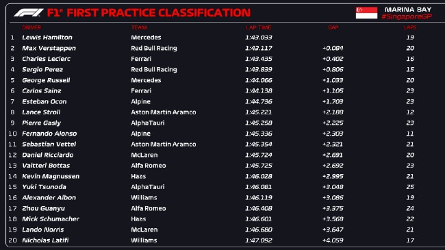 2022年F1新加坡大奖赛第1次练习赛成绩表: