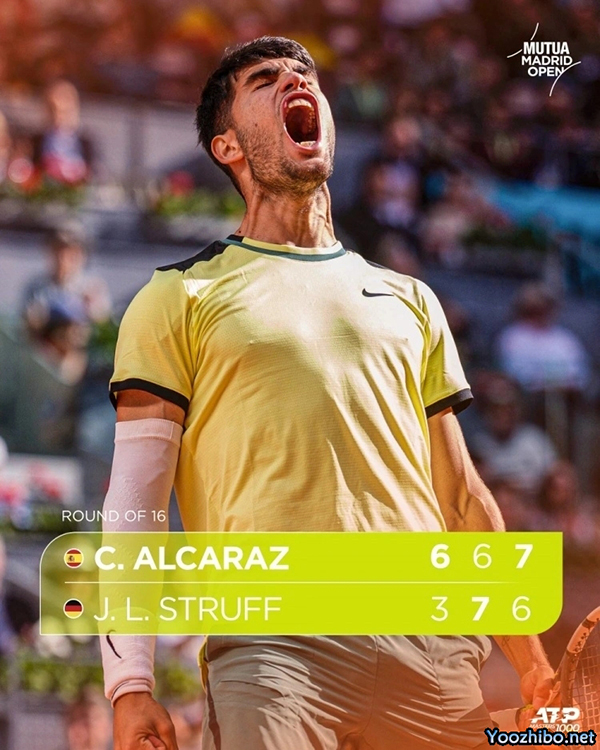 24直播网讯 在ATP大师赛马德里站的第四轮比赛中,2号种子阿尔卡拉斯与23号种子施特鲁夫进行了激烈的对抗。最终,阿尔卡拉斯以6-3、6-7(5)、7-6(4)的成绩战胜了施特鲁夫,成功晋级八强2。