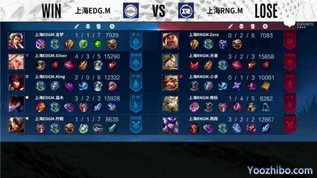 开局双方正常抢线。1分36秒上海EDG.M中路团战击杀阿古朵拿下一血。3分05秒上海EDG.M拿下暴君,上海RNG.M四人抱团抢中线。4分58秒上海EDG.M发育路越塔1换1,澜拿下主宰。6分02秒发育路团战上海RNG.M马超二连击破,打出一波1换2,摧毁敌方发育路外塔。6分40秒上海RNG.M主宰处击杀澜,摧毁敌方对抗路外塔。8分34秒上海EDG.M击杀阿古朵,拿下暴君,摧毁敌方发育路外塔。9分25秒上海EDG.M中路击杀阿古朵。10分21秒上海EDG.M拿下暗影暴君,摧毁敌方中路外塔,双方在野区互换一波血量。12分29秒上海EDG.M拿下暗影主宰。13分40秒上海EDG.M摧毁敌方全部二塔、对抗路高地,上海RNG.M高地塔下反杀澜,持续收割虞姬,拿下暗影暴君。17分41秒上海EDG.M摧毁敌方中路高地,拿下暗影主宰。19分03秒暗影主宰处上海EDG.M团灭对手摧毁水晶拿下比赛。