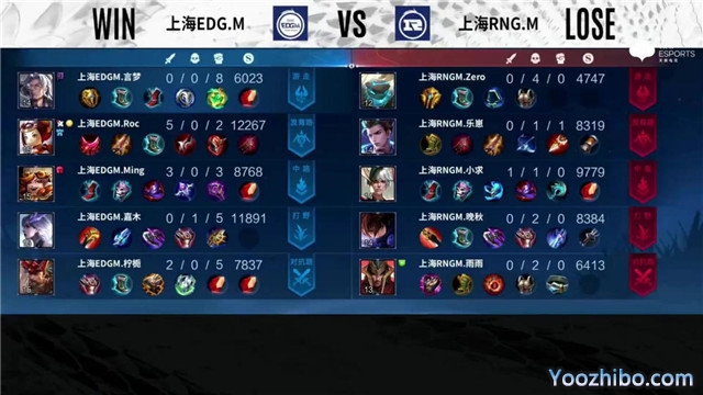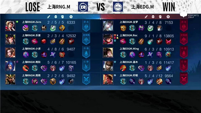 开局上海EDG.M上中换线,52秒野区吕布击杀橘右京拿下一血。2分04秒中路团战rng1换2。2分29秒野区上海RNG.M2换1,发育路射手互换血量,孙尚香被击杀。3分50秒上海EDG.M越塔追击,东皇太一被反杀。4分20秒上海RNG.M拿下暴君。5分01秒对抗路上海RNG.M打出1换2,5分23秒Roc中路二连击破,摧毁敌方中路外塔。6分18秒上海EDG.M击杀不知火舞。7分03秒上海EDG.M摧毁敌方发育路外塔,上海RNG.M摧毁敌方对抗路二塔,团战打出一波3换0。8分28秒上海EDG.M拿下主宰。9分43秒发育路上海EDG.M击杀不知火舞,野区上海RNG.M击杀赵云,双方打出一波1换1。10分36秒暗影暴君处团战上海RNG.M打出2换3。11分42秒上海EDG.M拿下暗影主宰,暗影暴君处团战上海RNG.M打出3换2,对抗路二塔被兵线摧毁。13分03秒上海EDG.M拿下暗影暴君。13分57秒中路上海EDG.M击杀张飞,发育路越塔击杀不知火舞,摧毁敌方发育路二塔。16分18秒上海EDG.M拿下暗影主宰,Roc四连超凡团灭对手,1换5摧毁水晶拿下比赛。