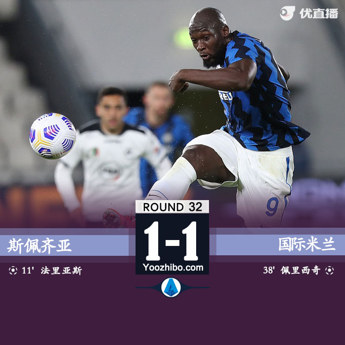有直播4月22日讯 北京时间4月22日凌晨2点45分,2020-21赛季意甲第32轮在阿尔贝托·皮科球场展开角逐,国际米兰客场挑战斯佩齐亚。上半场法利亚斯首开纪录,佩里西奇扳平比分,下半场卢卡库失单刀,劳塔罗中柱。最终国际米兰客场1-1战平斯佩齐亚,国米联赛遭遇两连平。积分榜方面,国米积76分,领先米兰10分继续领跑。
