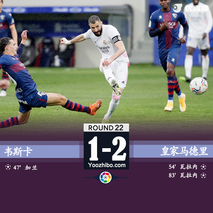 24直播网2月7日讯 北京时间2月6日晚23点15分,2020-21赛季西甲第22轮在阿尔科拉斯球场展开角逐,皇家马德里客场挑战韦斯卡。上半场维尼修斯失良机,下半场加兰世界波,瓦拉内梅开二度,奥德里奥索拉伤退。最终皇家马德里客场2-1逆转战胜韦斯卡,积分榜方面,皇马积43分距榜首7分。