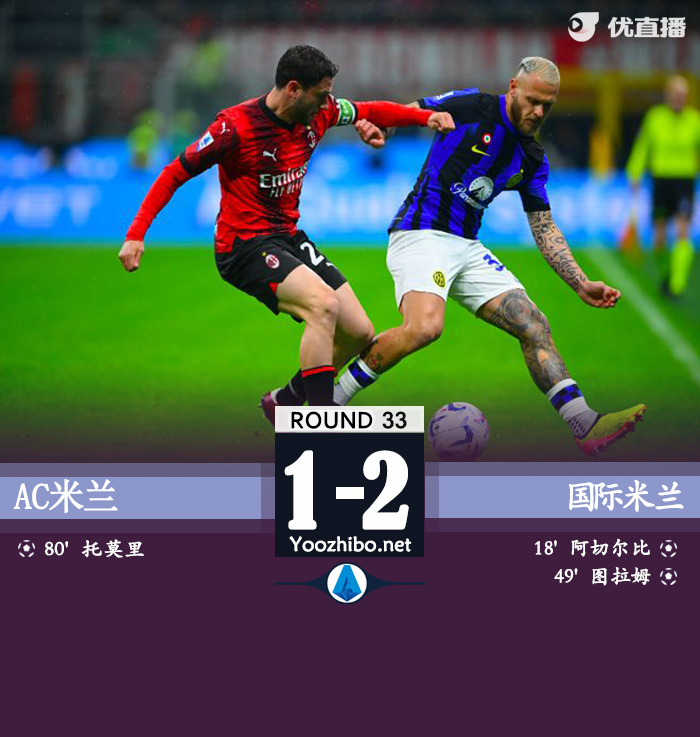 24直播网讯:北京时间4月23日,意大利足球顶级联赛第33轮,AC米兰在主场迎战国际米兰。比赛中,AC米兰的托莫里取得进球,而国际米兰的阿切尔比和马库斯-图拉姆也分别建功。最终,国际米兰以2-1战胜AC米兰。