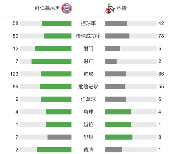 查看:拜仁vs科隆 全场录像技术统计: