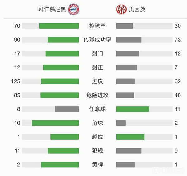 查看:拜仁慕尼黑vs美因茨 全场录像技术统计: