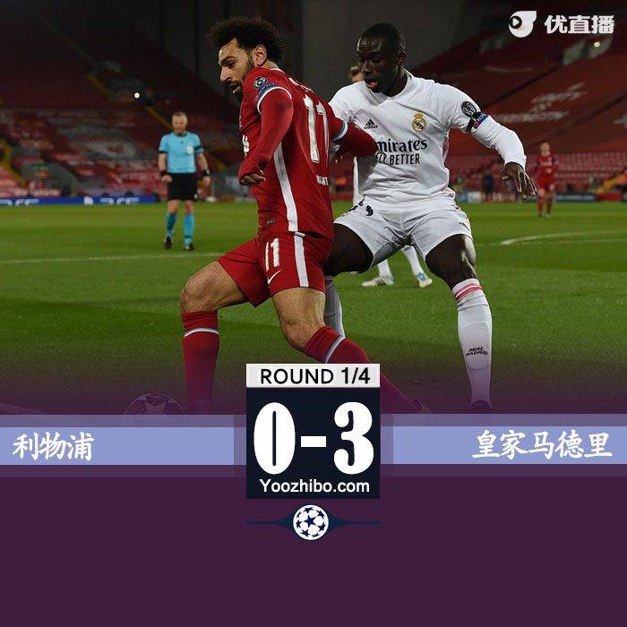 24直播网4月15日讯 北京时间04月15日星期四03:00,欧冠1/4决赛次回合利物浦主场迎战皇家马德里。上半场,库尔图瓦扑出萨拉赫单刀,本泽马射门折射中柱,红军狂攻无果,利物浦半场暂0-0皇马。下半场,双方互有攻守皆无明显破门机会。最终,皇马0-0总分3-1利物浦,晋级四强将对阵切尔西。