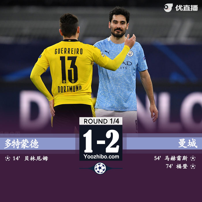 24直播网4月15日讯 北京时间4月15日凌晨3点整,2020-21赛季欧冠1/4决赛次回合在伊杜纳信号公园球场展开角逐,多特蒙德坐镇主场迎战曼城。上半场贝林厄姆首开纪录,德布劳内中框,下半场埃姆雷-詹送点,马赫雷斯点射扳平,福登爆射反超比分。最终曼城客场2-1战胜多特蒙德,总比分曼城4-2淘汰多特晋级四强,曼城半决赛将对阵巴黎圣日耳曼。
