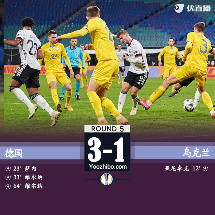 24直播网讯:北京时间11月15日凌晨3:45,2020年欧国联小组赛第5轮继续进行,A级D组之中,在莱比锡红牛竞技场,德国队主场迎战乌克兰队。上半场,亚伦丘克打破僵局,格雷茨卡两次助攻,萨内和维尔纳破门反超比分,德国2-1领先乌克兰。下半场,维尔纳实现梅开二度,而津琴科、马罗斯和莫拉斯射门分别中柱。最终,德国队3-1逆转乌克兰。5轮战罢,德国队2胜3平拿到9分,由于西班牙本轮1-1战平瑞士,德国队以1分优势反超西班牙,位居小组第一。