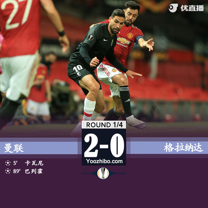 24直播网4月16日讯 北京时间4月16日凌晨3:00,20-21赛季欧联杯1/4决赛第二回合继续进行,曼联在老特拉福德主场迎战格拉纳达。上半场,博格巴助攻卡瓦尼抽射破门,曼联1:0暂时领先格拉纳达。下半场补时阶段,巴列霍自摆乌龙。最终曼联主场2:0格拉纳达,曼联两回合总比分4:0轻松晋级四强。