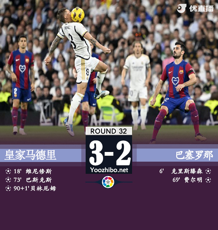 24直播网讯:北京时间4月22日,西班牙足球甲级联赛迎来了第32轮的激烈对决,皇家马德里在主场迎战巴塞罗那。上半场,拉菲尼亚角球助攻克里斯滕森头球破门,亚马尔加速过人后打门被扑,库巴西绊倒巴斯克斯送点后维尼修斯点射扳平,亚马尔巧射被挡后皮球未能越过门线,德容与巴尔韦德对脚后伤退;下半场,亚马尔传中被扑后费尔明补射得手,维尼修斯助攻巴斯克斯凌空打门入网,维尼修斯快速前插打门被封堵,补时阶段贝林厄姆推射破门上演绝杀。最终,皇家马德里以3-2险胜巴塞罗那。