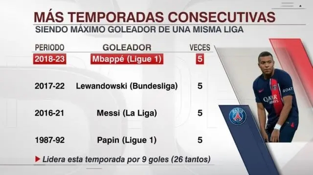 24直播网讯 姆巴佩有望在离开法甲之前连续6年获得联赛金靴,从而成为五大联赛首位做到这一点的球员。