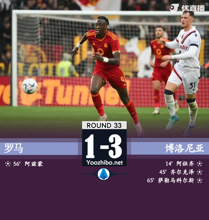 24直播网讯:在4月23日的意大利足球顶级联赛第33轮比赛中,罗马队迎战博洛尼亚队。上半场卡拉菲奥里传中,阿祖齐精彩倒钩破门,之后阿祖齐送助攻,齐尔克泽破门扩大比分。下半场阿兹蒙门前三连击扳回一球,随后齐尔克泽送助攻,萨勒马克尔斯单刀挑射破门。全场结束,罗马1-3不敌博洛尼亚。