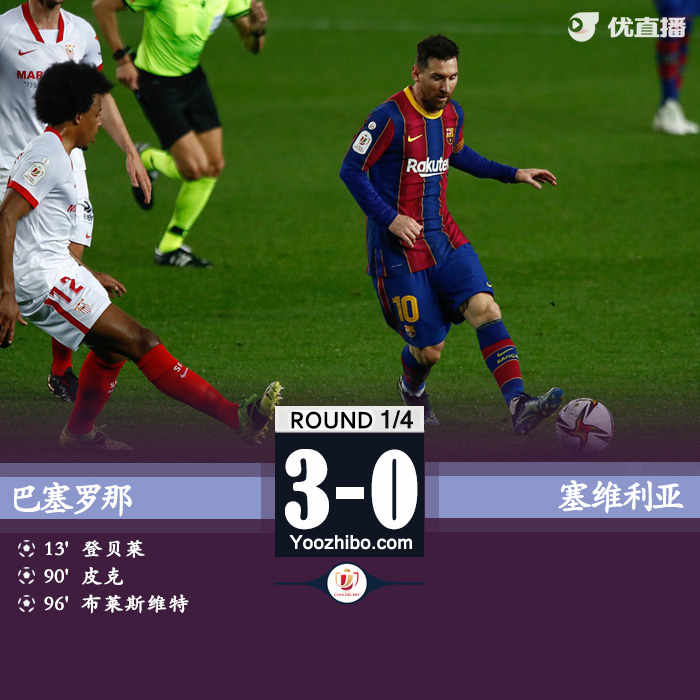 24直播网3月4日讯 北京时间3月4日凌晨04:00,国王杯半决赛次回合巴塞罗那主场迎战塞维利亚。上半场,登贝莱平地起惊雷惊艳世界波,巴萨半场1-0领先塞维利亚。下半场,明格萨犯规送点,特尔施特根扑点,费尔南多被罚下,皮克压哨破门,巴萨总比分2-2塞维将比赛拖入加时。加时上半场,布莱斯维特破门。最终全场比赛结束,巴萨3-0,总比分3-2逆转塞维利亚进决赛。巴萨国王杯决赛对手,将会是莱万特vs毕尔巴鄂的胜者。