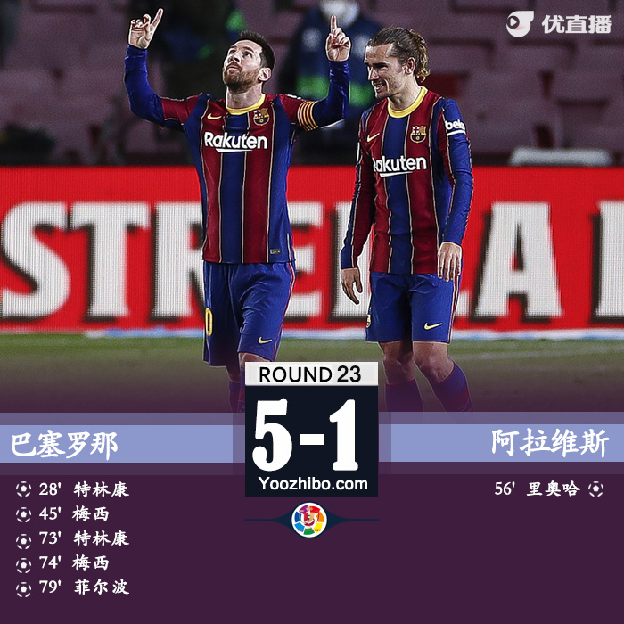 24直播网2月14日讯 北京时间2月14日04:00,西甲第23轮继续进行,巴塞罗那主场迎战阿拉维斯。上半场,莫里巴助攻特林康破门帮巴萨取得领先,梅西世界波扩大比分。下半场,里奥哈利用莫里巴的传球失误扳回一球,特林康和梅西连入两球锁定胜局,菲尔波锦上添花。最终,巴塞罗那5-1大胜阿拉维斯,取得七连胜升至第2位。