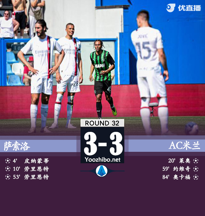 24直播网讯:北京时间4月14日,意甲联赛迎来第32轮的激烈对决,萨索洛与AC米兰展开了激烈的较量。上半场刚开场皮纳蒙蒂闪击建功,随后劳里恩特突入禁区射门被扑随后补射破门,之后莱奥1V2后低射追回一球。下半场阿德利被抢断,劳里恩特破门完成双响,随后莱奥外脚背传中被扑,约维奇补射破门,比赛尾声加比亚胸部一停,奥卡福尔抽射扳平,本场比赛丘库埃泽两粒进球被吹体毛越位。最终米兰3-3战平萨索洛。