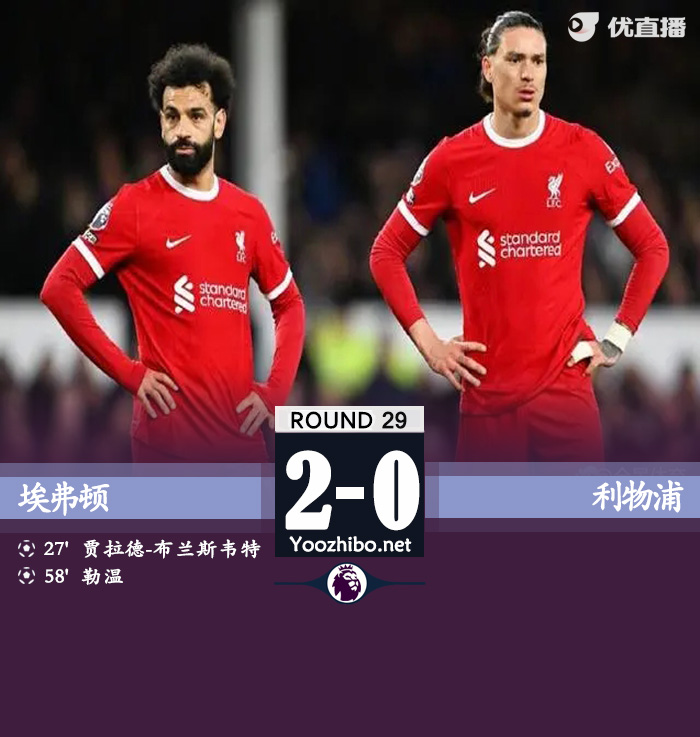 24直播网讯:北京时间4月25日凌晨3:00,2023-24赛季英超联赛第29轮补赛,利物浦客战埃弗顿。上半场利物浦后防集体犯错,科纳特乌龙助攻布兰斯韦特破门,努涅斯失单刀,利物浦暂0-1埃弗顿;下半场麦克尼尔角球助攻勒温破门,路易斯-迪亚斯中柱,最终利物浦0-2埃弗顿,距离榜首阿森纳3分,领先少赛两场的曼城1分。