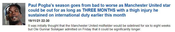 如果按照12周的情况推算,博格巴不仅今年已经报销,而且明年1月也无法登场,要到2月5日之后才能回归球场。
