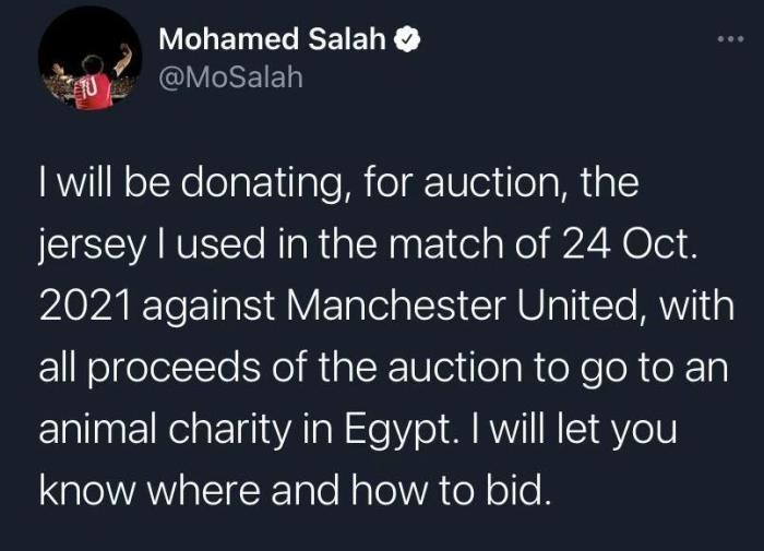 我将把我在2021年10月24日对阵曼联时所穿的球衣拍卖,拍卖的所有收益将捐给埃及的一家动物慈善机构,之后我会告诉你们在哪里以及如何出价。
