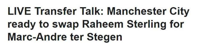 《国家报》称,曼城主帅瓜迪奥拉对特尔施特根很感兴趣,希望得到这位德国国门来充实自己球队在门将位置上的阵容厚度,并且他们愿意用斯特林来交换。