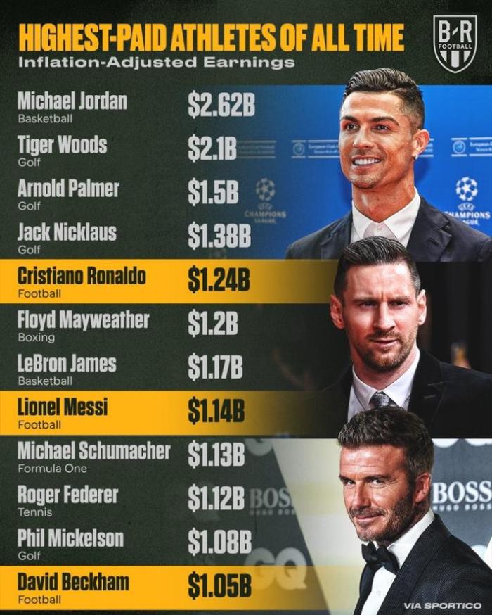 24直播网11月06日讯 Sportico日前统计了世界体坛运动员历史收入排行,前十中只有C罗和梅西两名足坛人士。