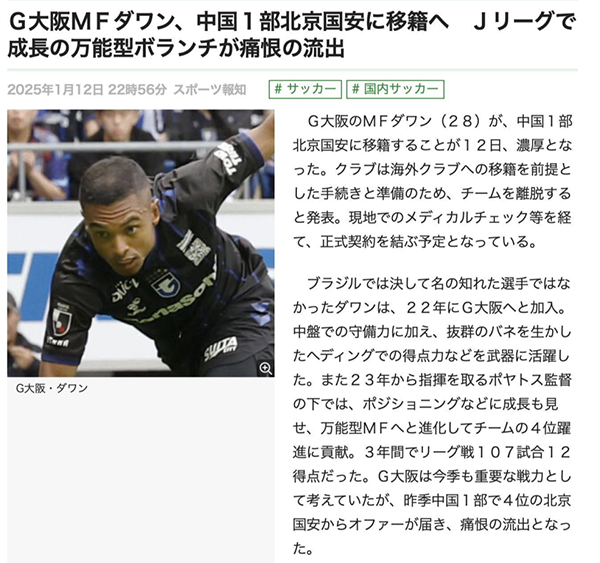 12日下午,日本联赛豪门大阪钢巴俱乐部官方宣布,队内巴西后腰达万因谋求海外转会而离队。《体育日本》记者垣内一之(绰号“日本罗马诺”)透露他将前往中国,但并未透露具体是哪家俱乐部,只是否认并不是上海海港。最终,达万的下家也水落石出,那便是中超球队北京国安。