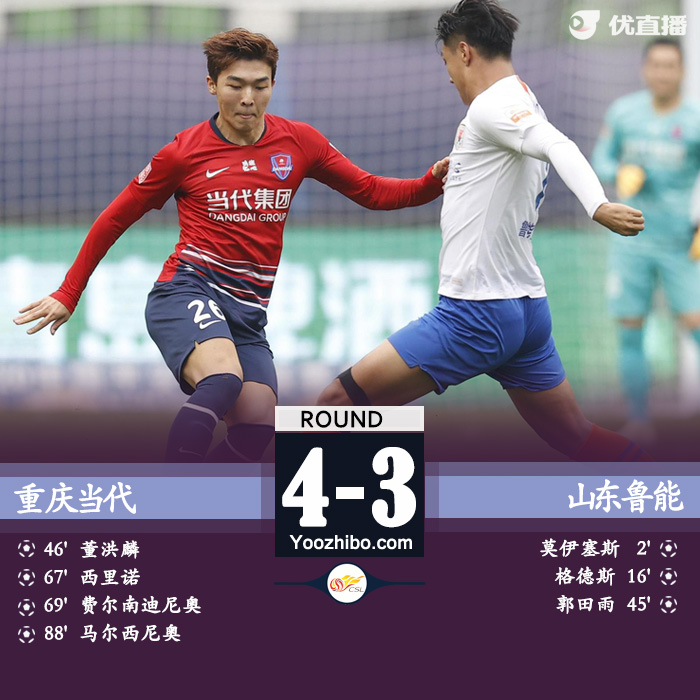 24直播网讯:11月6日下午,2020赛季中超联赛第二阶段5-6名决赛首回合比赛展开争夺,山东鲁能在3球领先情况下,被重庆当代连进4球逆转,最终山东鲁能3-4落败。第3分钟,刘彬彬边路传中,莫伊塞斯抢射破门。第17分钟,郭田雨送次妙传,格德斯推射空门得手。46分钟,莫伊塞斯助攻,郭田雨停球凌空抽射得分。第47分钟,郑铮防守出现失误,董洪麟推射空门得手。第69分钟,马尔西尼奥头球被挡,费尔南迪尼奥补射破门。第89分钟,西里诺送出直塞,马尔西尼奥单刀破门。